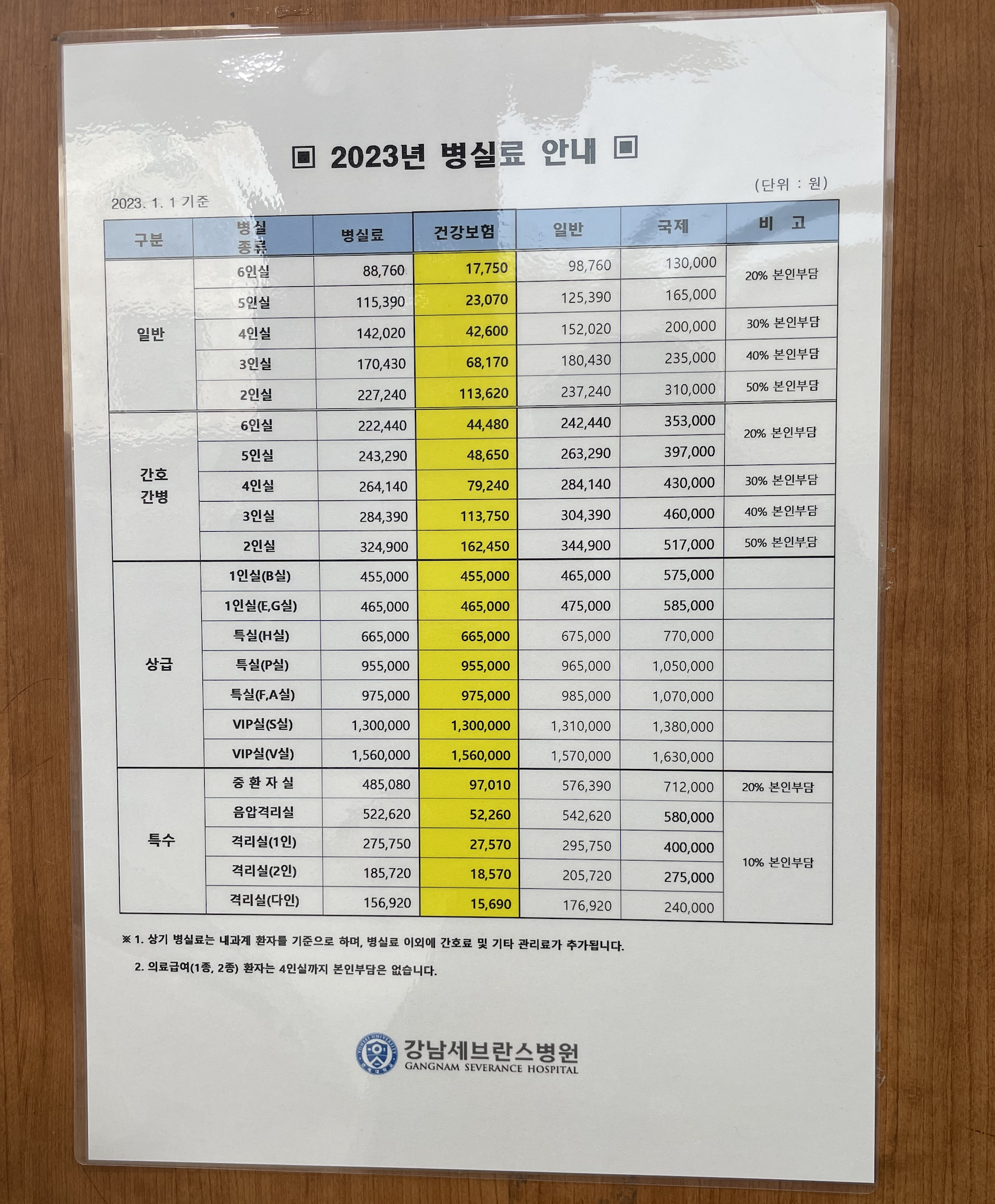 강남세브란스 병원 병실 및 병실료