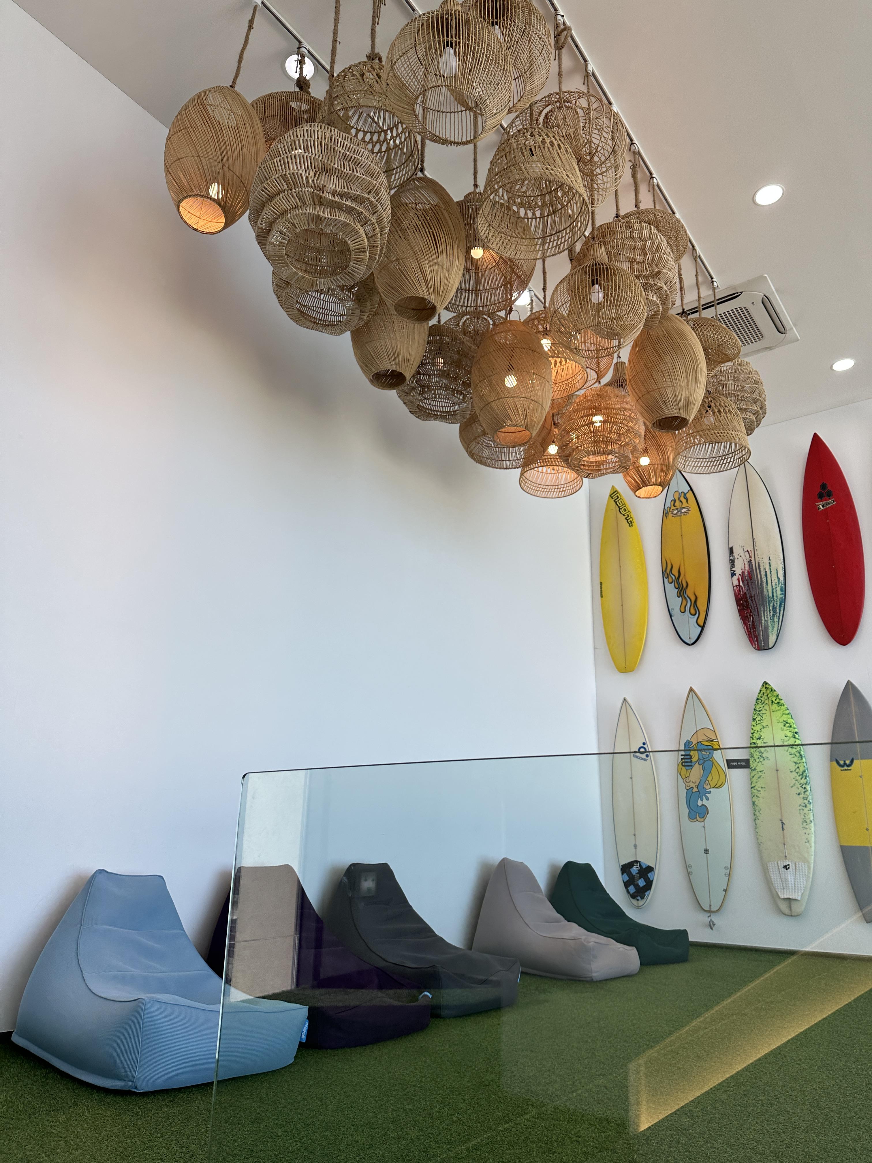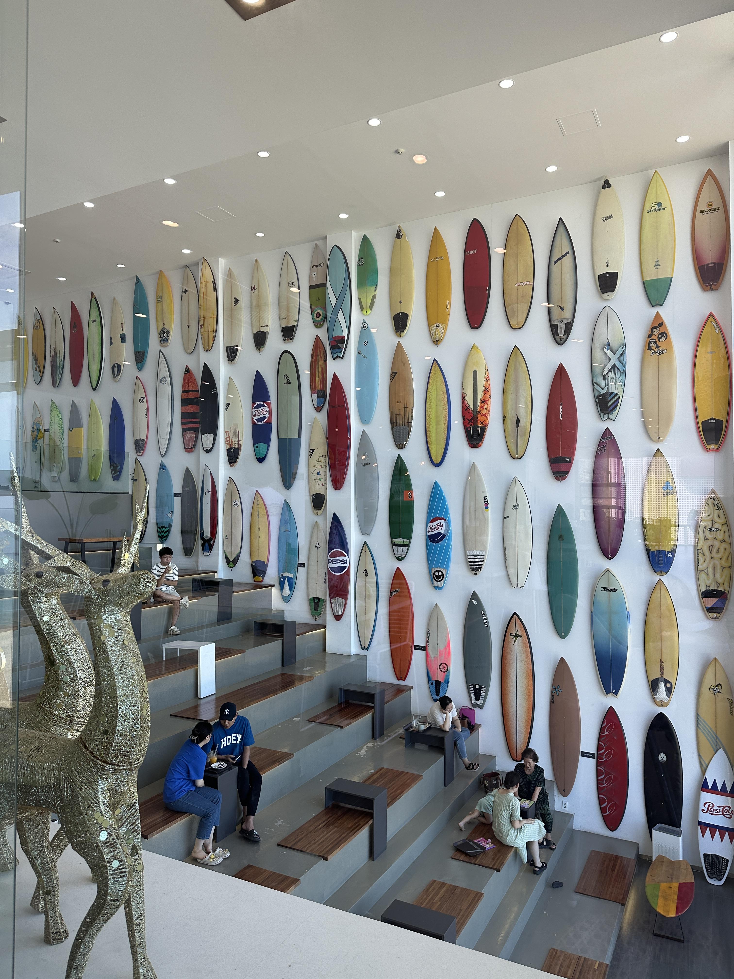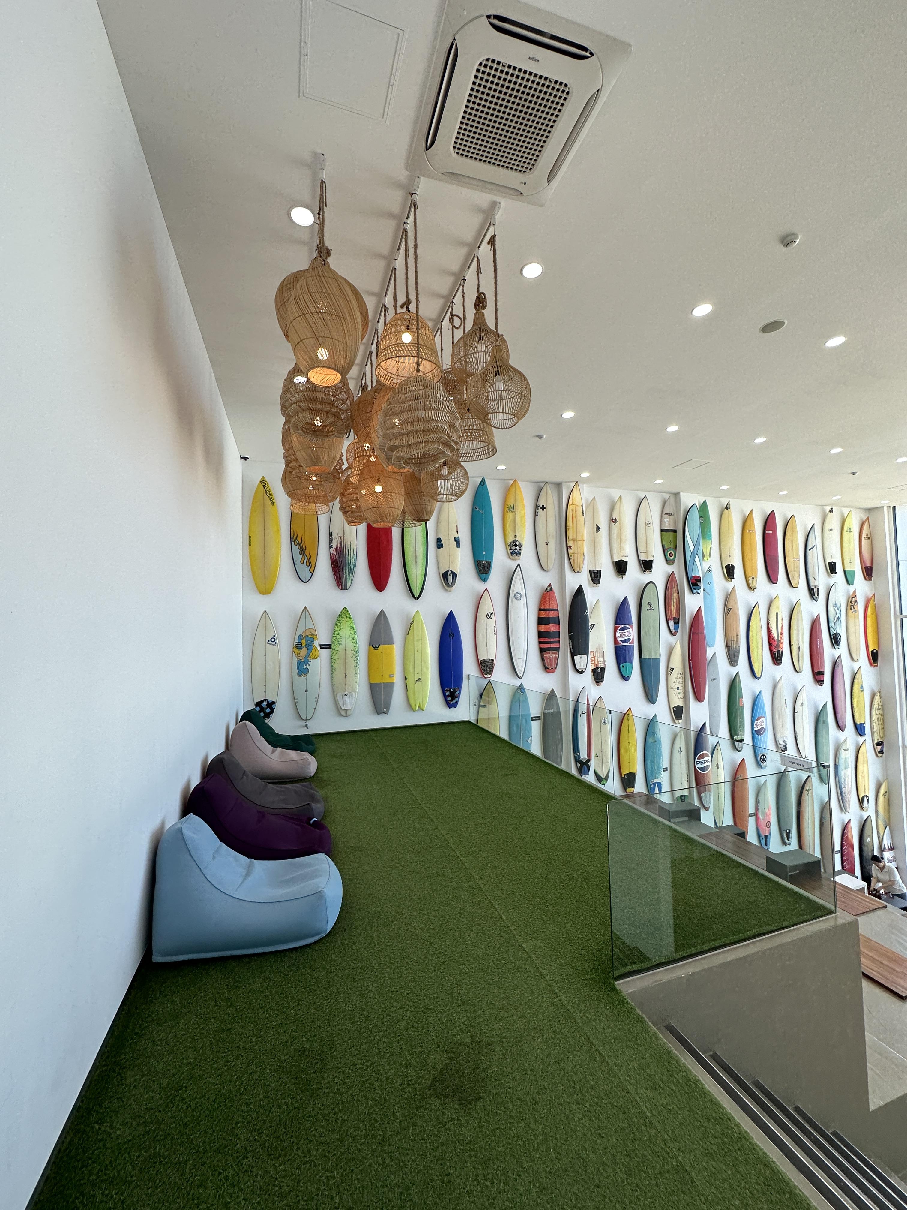 내부에는 한쪽 벽면에 서핑보드가 쭉 ~! DP 된 월이 있고