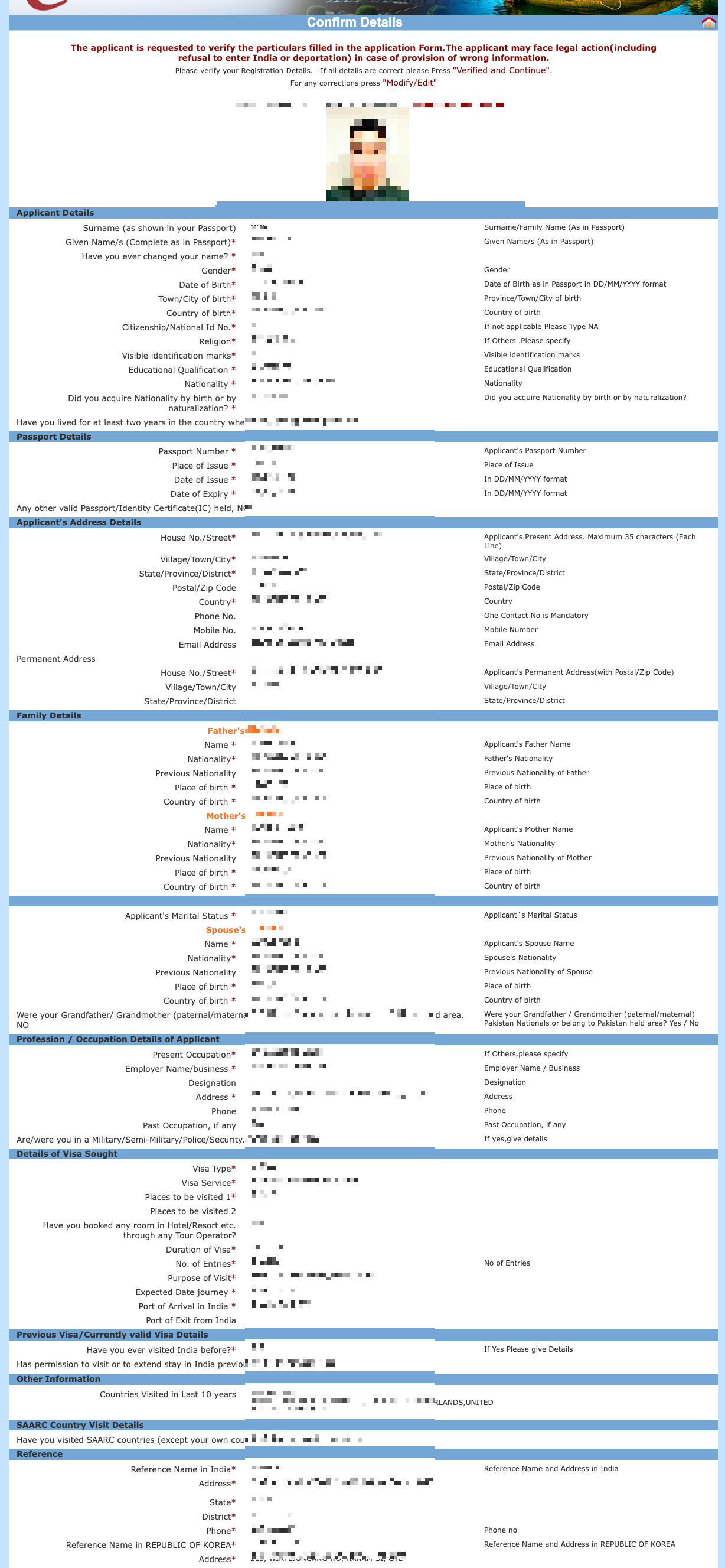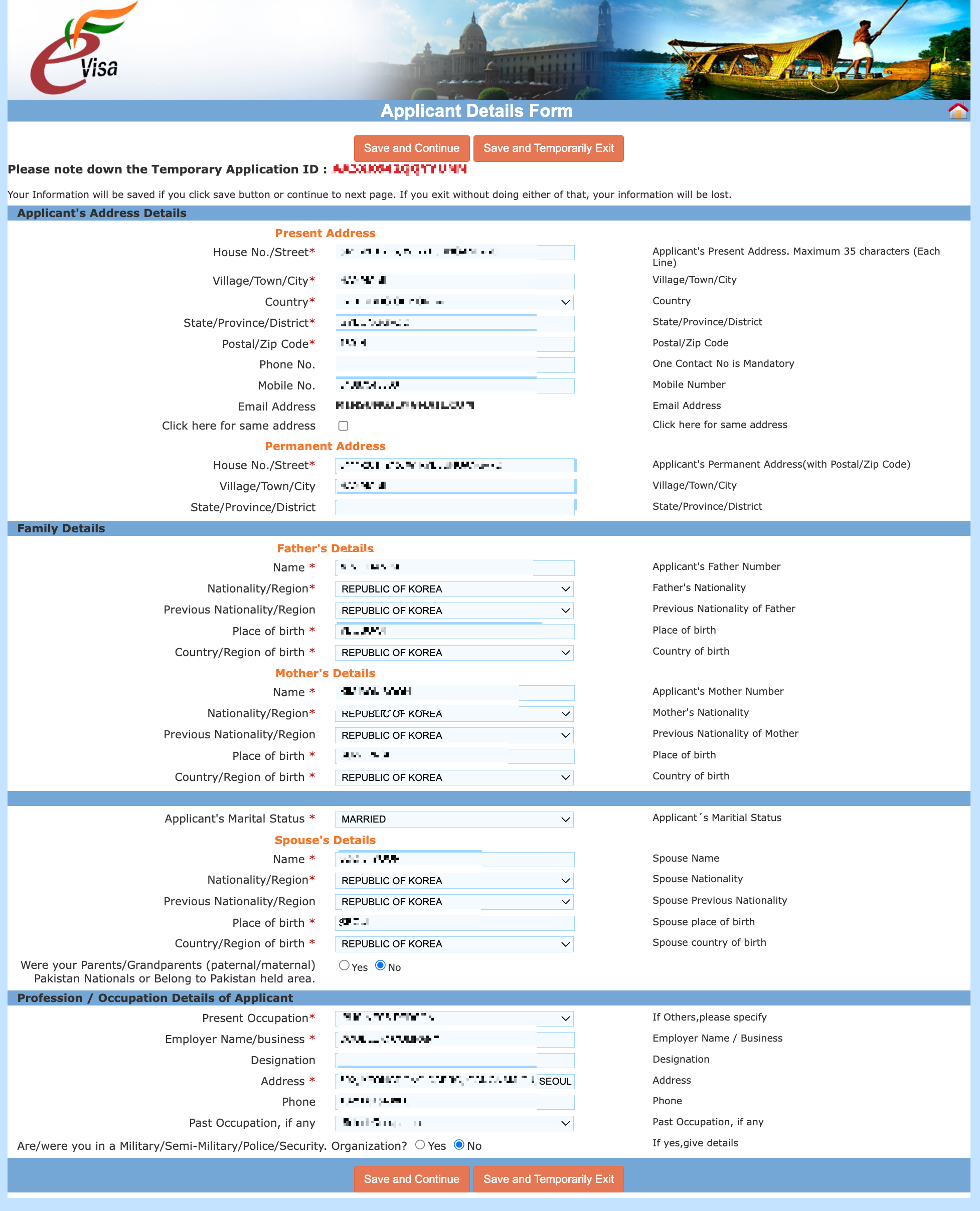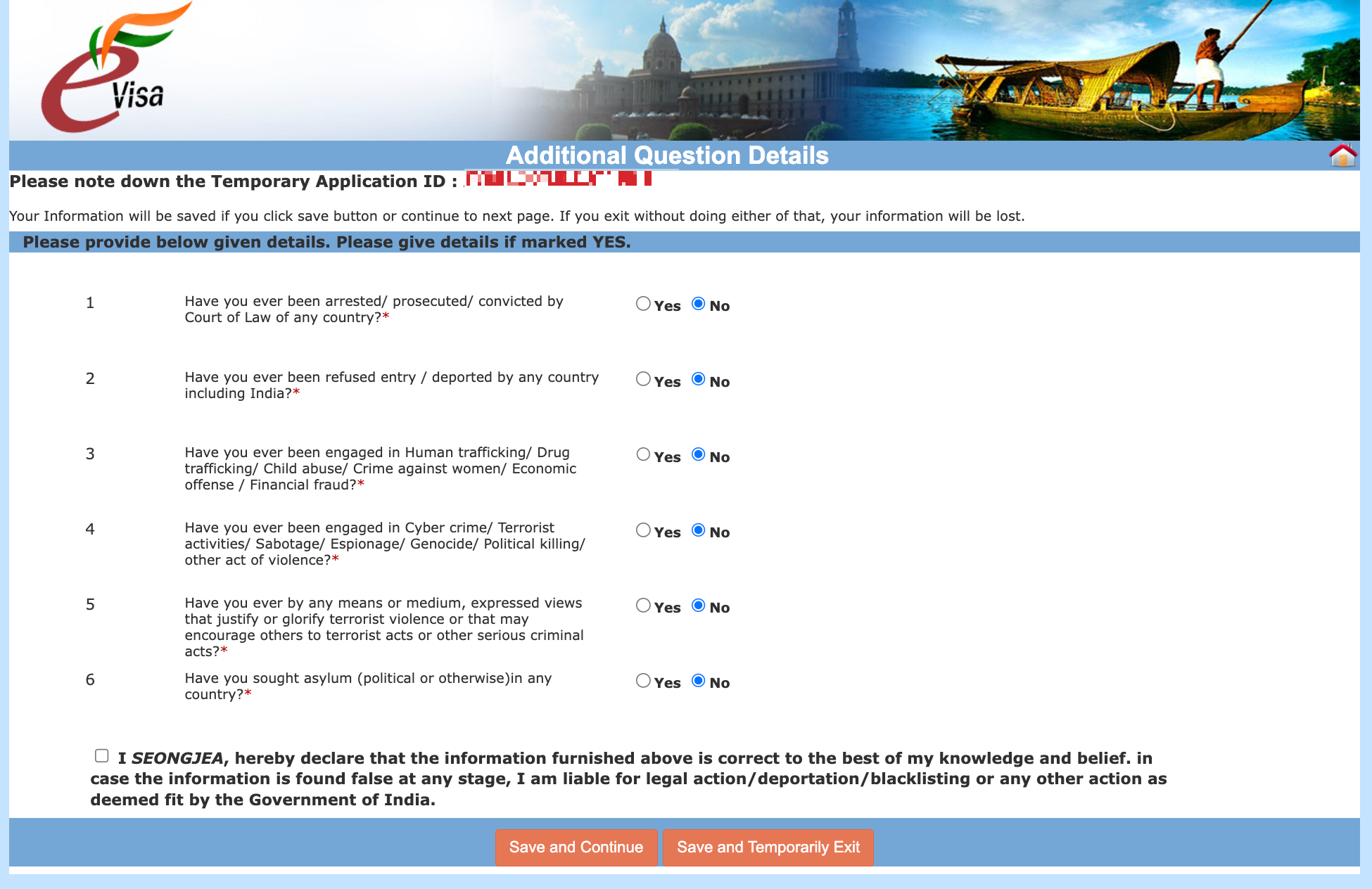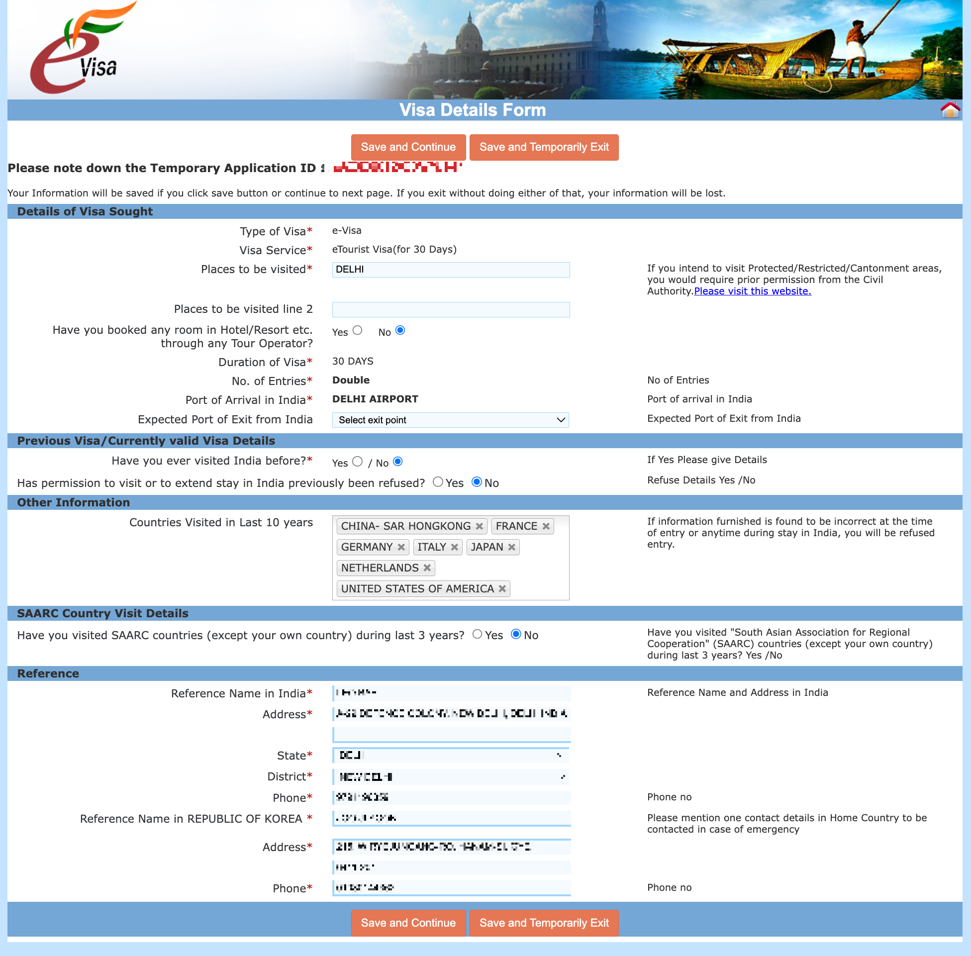 이번 페이지는 인도 입국 중 체류 관련 정보 입력